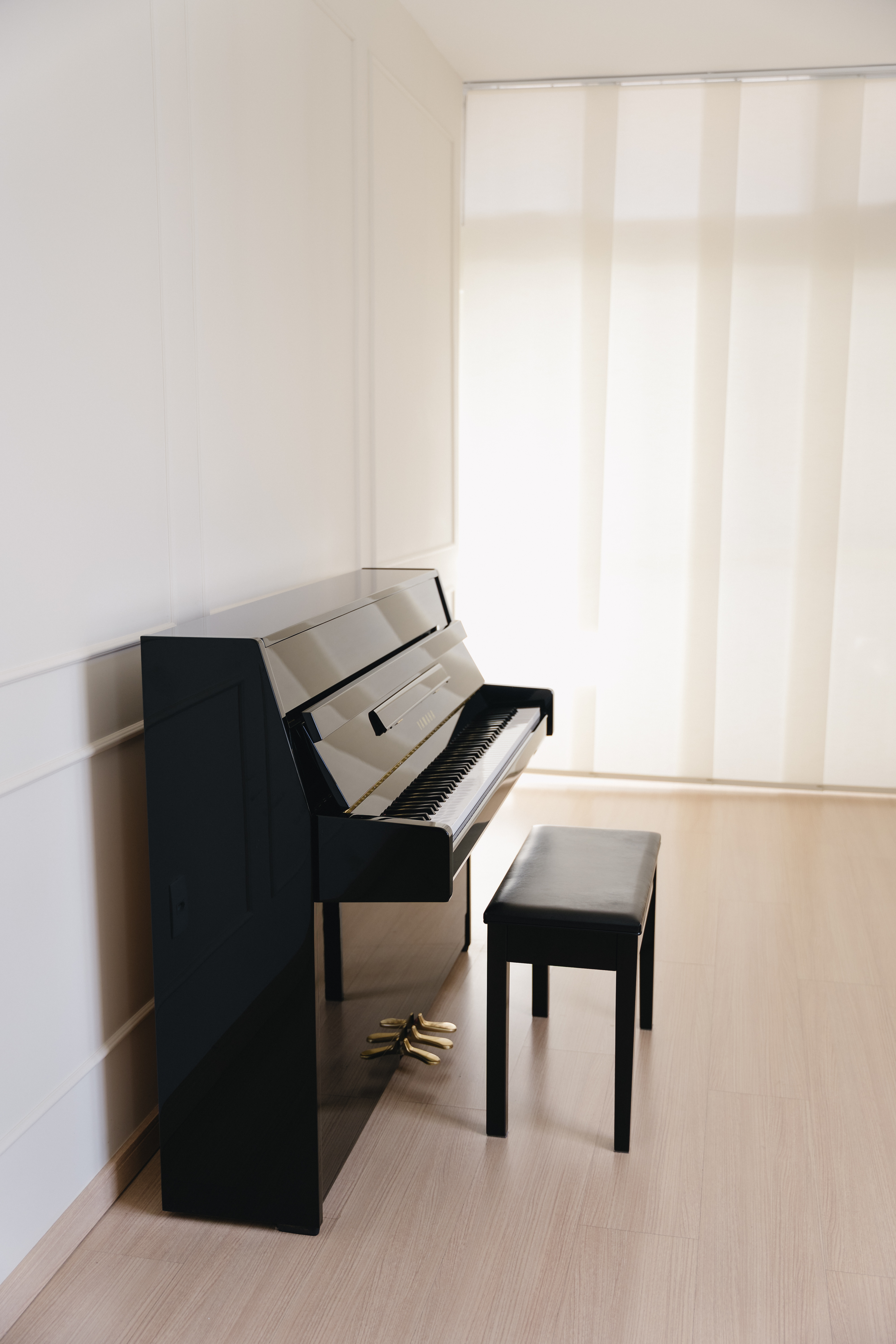 O espaço conta com um piano acústico Yamaha de última geração, que é referência em qualidade e sonoridade, em uma sala de estilo clássica, ideal para o aprendizado e vivência musical.